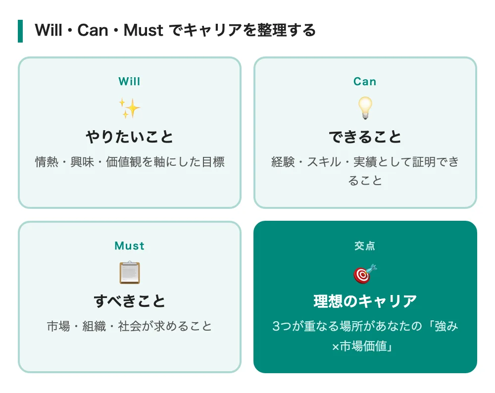特に「Will-Can-Must」の整理は、キャリアの方向性を定めるうえで非常に有効なフレームワークです。